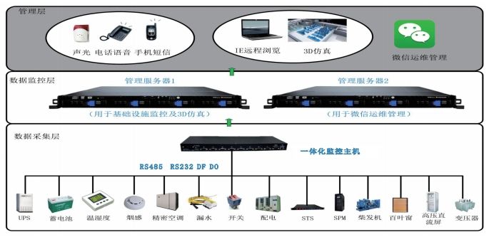 機(jī)房動環(huán)綜合監(jiān)管系統(tǒng)是一個綜合應(yīng)用計算機(jī)網(wǎng)絡(luò)、物聯(lián)網(wǎng)、云計算、無線通信、自動控制等技術(shù)構(gòu)成的管理系統(tǒng),以計算機(jī)技術(shù)為基礎(chǔ)、基于集中管理監(jiān)控模式的自動化、智能化和高效率的技術(shù)手段針對機(jī)房的動力、環(huán)境、消防、網(wǎng)絡(luò)、安防等系統(tǒng)的監(jiān)控,實現(xiàn)遠(yuǎn)程運維。
